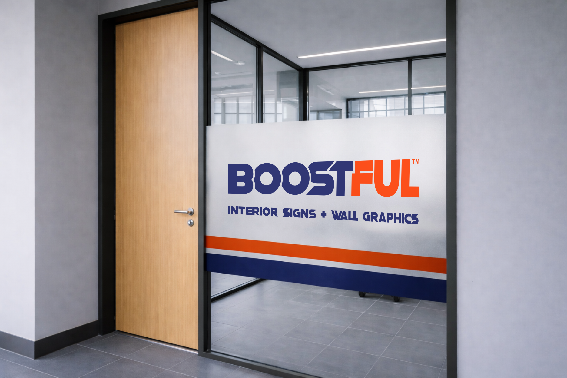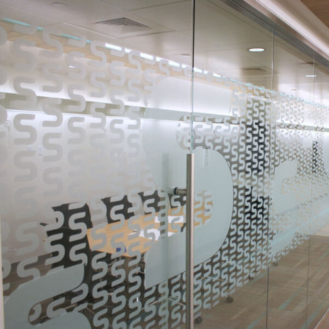 Frosted glass graphics balance privacy and transparency while reinforcing brand presence in a subtle, architectural way.