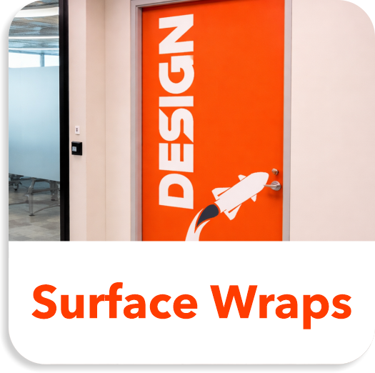 Surface wraps allow you to brand far more than just walls. Commercial doors, elevator interiors and exteriors, refrigerators, desks, cabinets, counters, lockers, columns, and feature panels can all be wrapped to create a cohesive branded environment without construction or replacement.