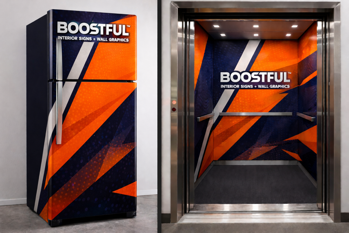 Using printed and contour cut vinyl or full coverage wraps, these graphics apply directly to doors, desks, fridges, cabinets, and other interior surfaces. They allow ordinary fixtures to become branded assets while maintaining function and durability.