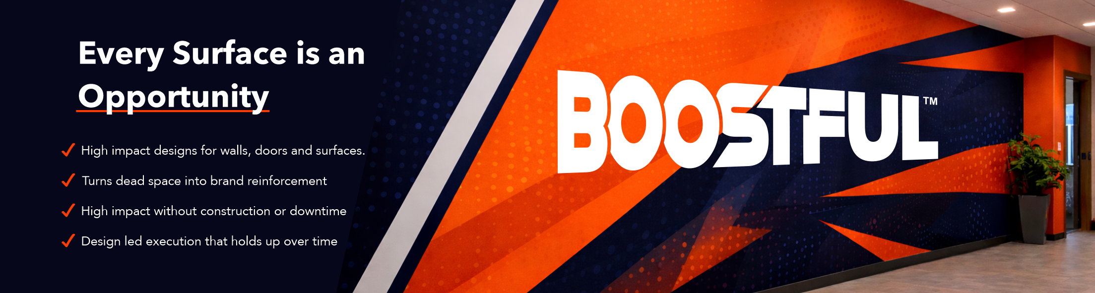 This is a cost effective way to introduce color, texture, messaging, and personality across a space using assets you already own. No thickness. No hardware. No fabrication. Just clean, intentional branding integrated into the environment rather than added on top of it.